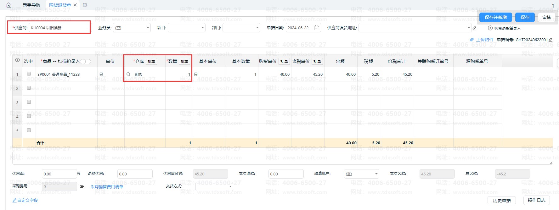 点击【购货】-打开【购货退货单】界面,直接录入退货信息,保存审核单据即可
