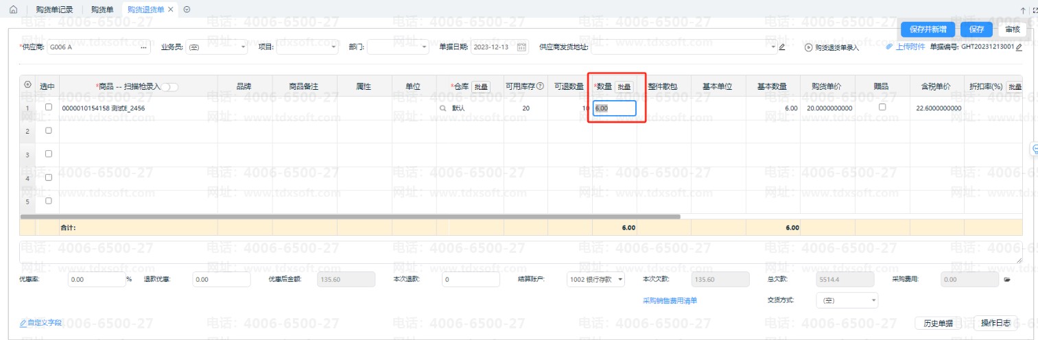 然后,系统自动跳转至购货退货单编辑界面,购货单的商品信息全部带到购货退货单编辑界面,可以直接保存退货单,或是修改实际退货数量等信息,最后【保存/审核]单据即可,如图: