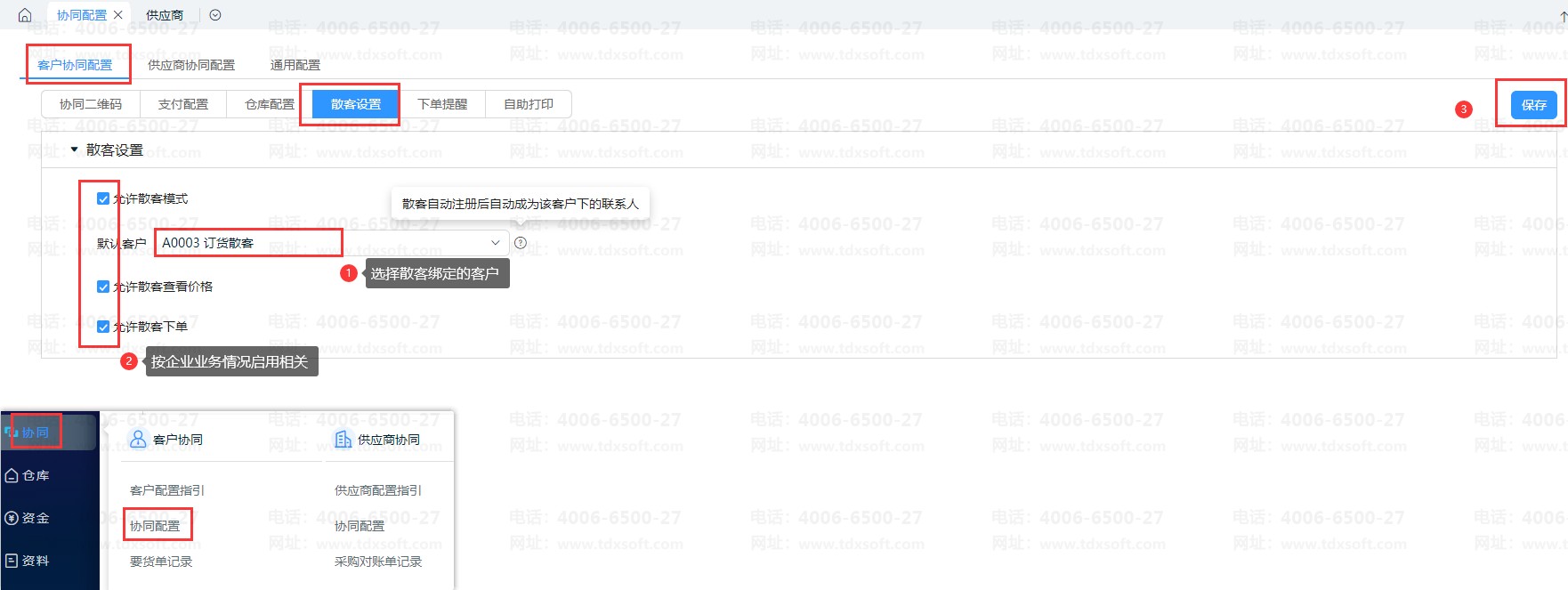 系统支持散客管理,在【协同】-【客户协同】-【协同配置】