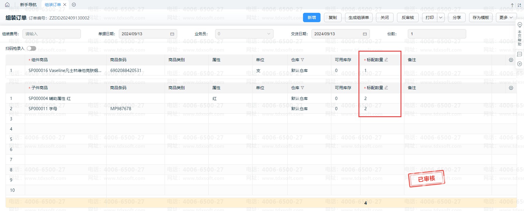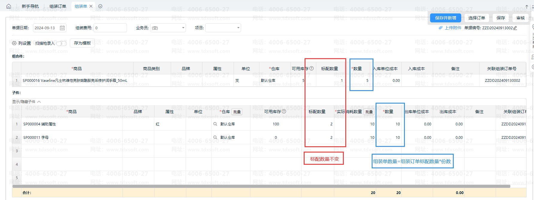 待按组装订单下推生成组装单时,系统则按这个配置数量比例计算,并把组装订单的标配数量带到组装单上。