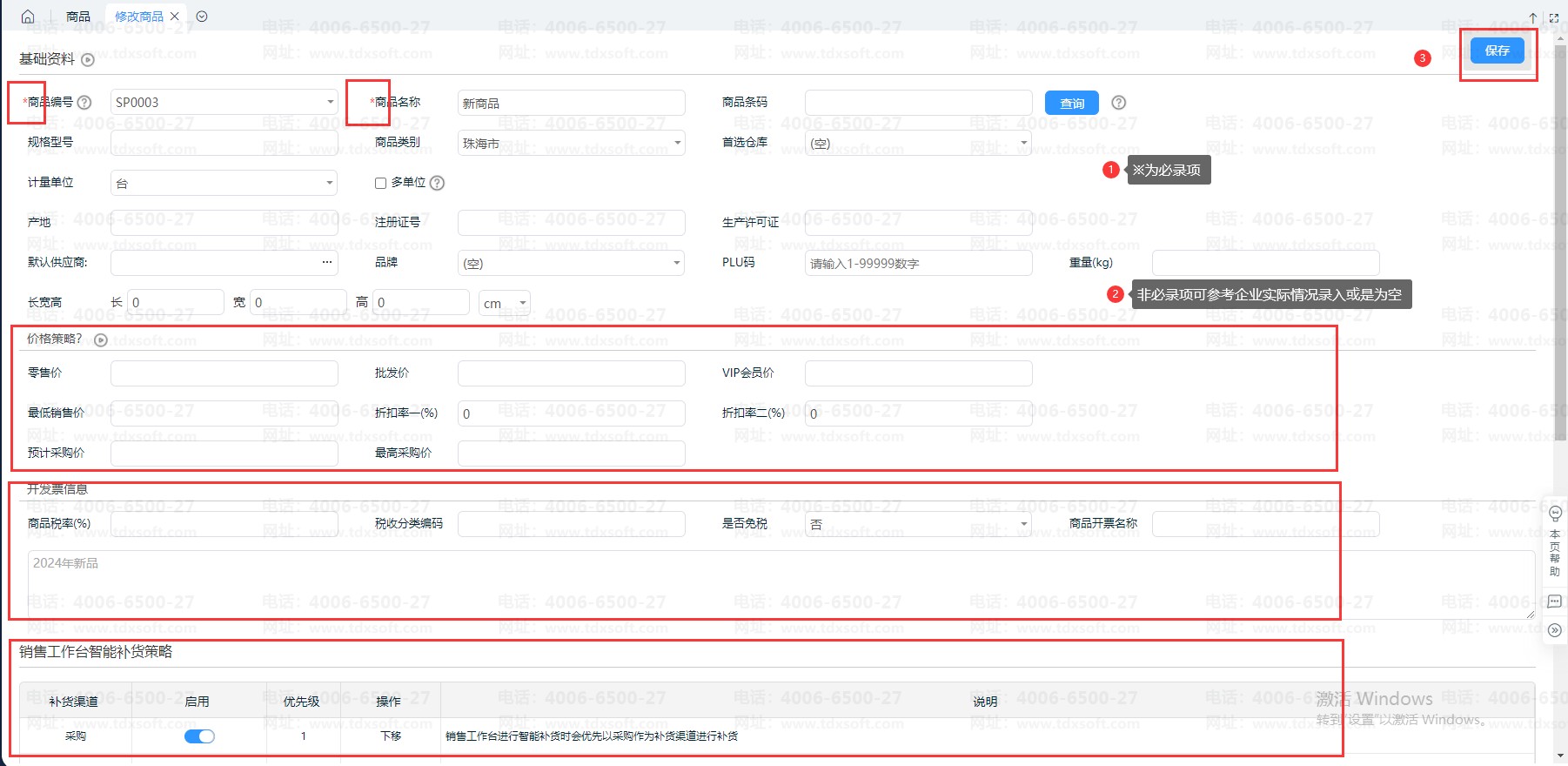 2、商品编辑界面的字段为系统预置项,暂不支持自定义新增、删除,也无法修改字段别名。