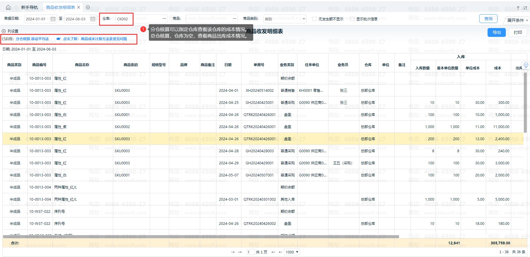 商品库存异常排查时可优先通过 “商品收发明细表”,该表详细记录了系统内所有商品的出入库明细、相应的出入库成本、结存数量及其成本,常用于验证商品成本的准确性。