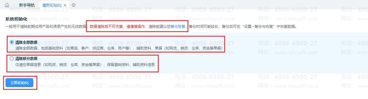 操作重新初始化,将会把所有数据全部删除重新建账,请慎用!