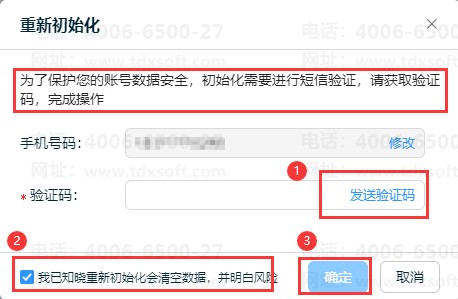 3、完成上一步后,弹出【重新初始化】对话框,完成短信验证,即可重新初始化成功。(验证手机号为管理员绑定的手机号)