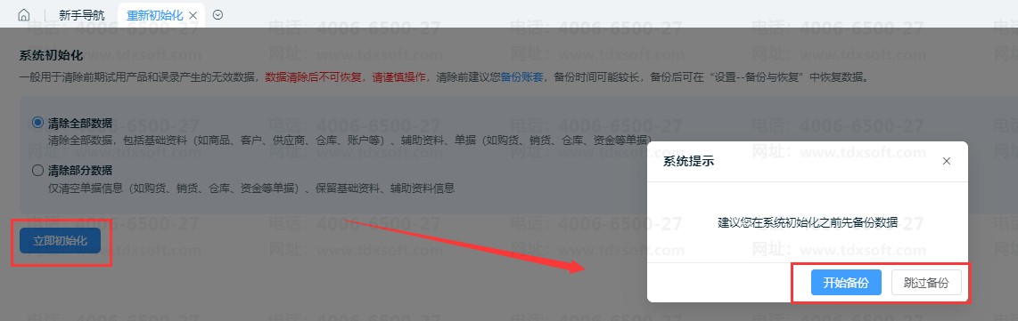 ①开始备份:重新初化前,建议备份当前账套数据,点击【开始备份】系统自动备份,备份成功后,跳转至下一步。
