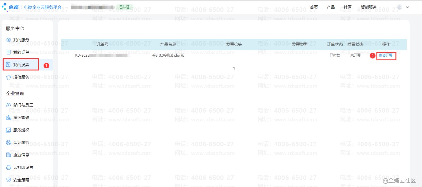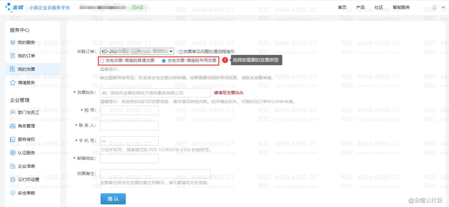 1:为响应国家环保号召,仅支持全电发票自助申请。如果需要纸质的专用发票,请联系您的产品营销顾问或售后申请