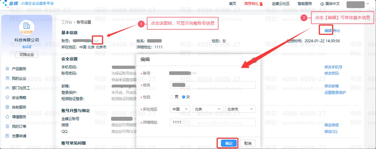 说明:仅账号本人登录后可修改其账号信息,管理员及其他子账号均无法对任意账号的信息进行修改。