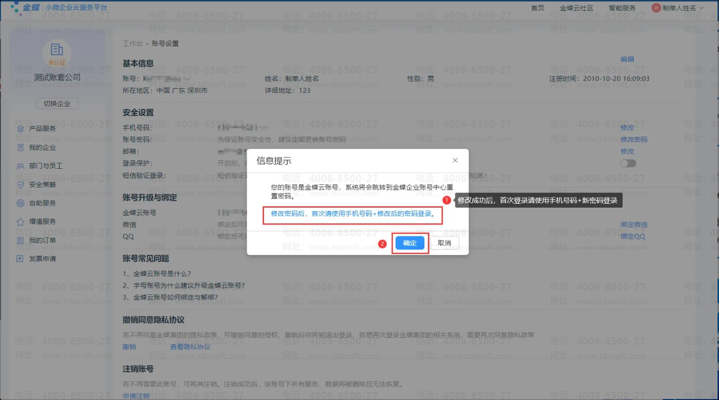 4、信息提示【确定】:修改密码后,首次请使用手机号码+修改后的密码登录。