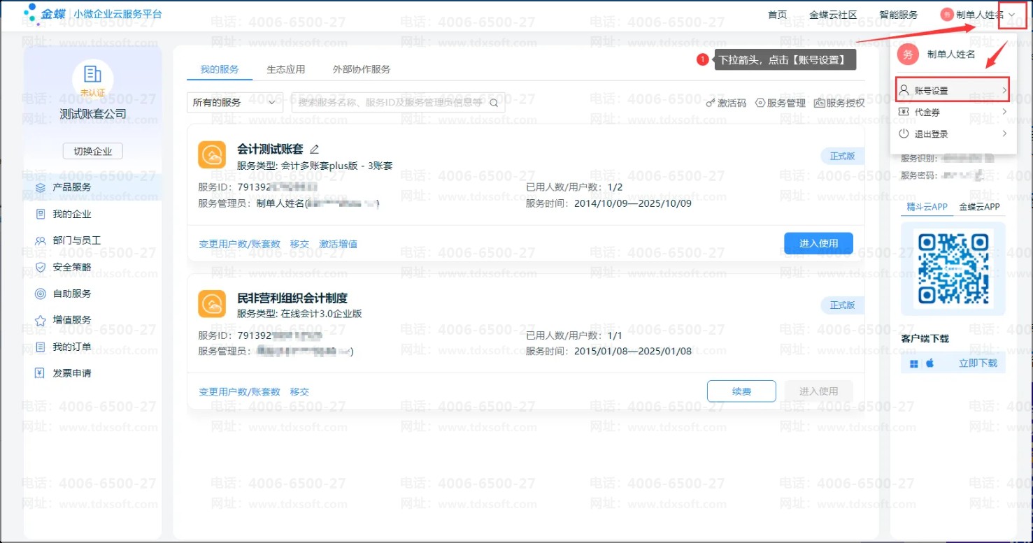 1、 登陆精斗云官网(www.jdy.com) ,进入工作台,点击右上角头像,下拉选择【账号设置】。