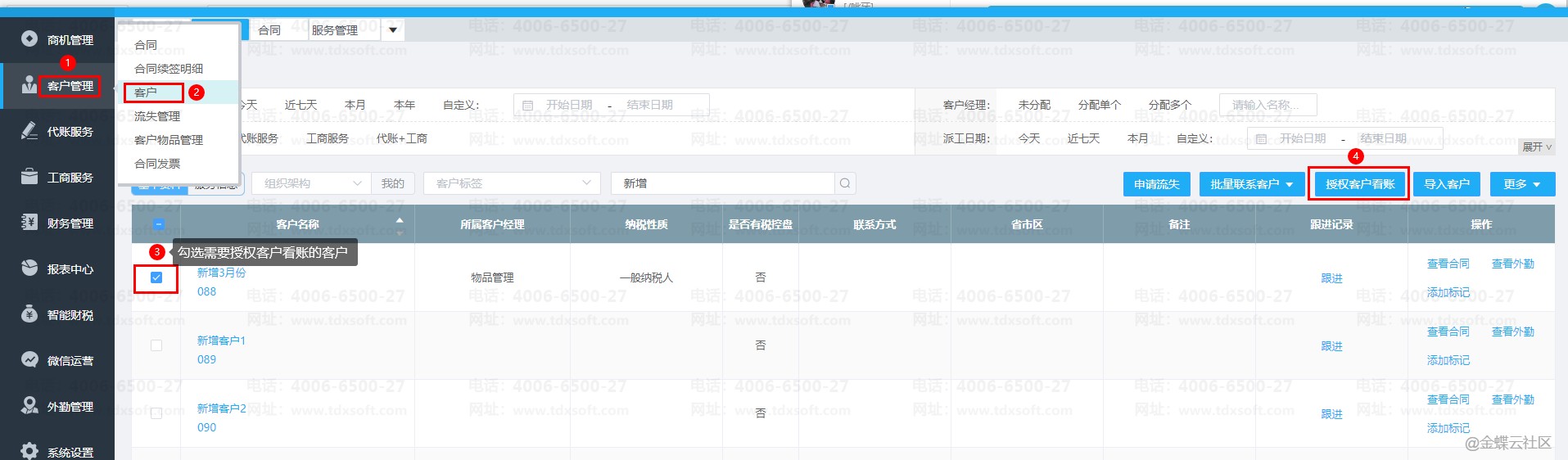 1.【客户管理】→【客户】选择授权的客户点击【授权客户看账】