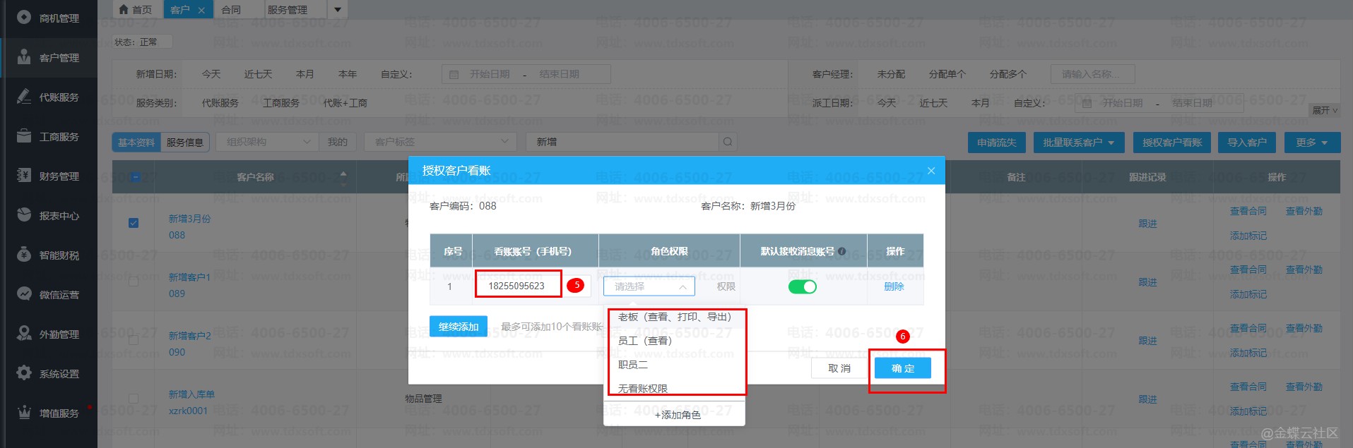 2. 填写客户账号(手机号),选择角色权限,单击确定