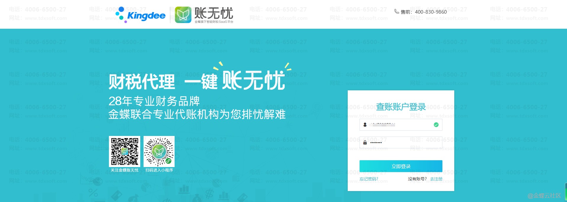 代账客户通过微信搜索“金蝶账无忧”小程序,输入登录账号(即看账账号),接收并录入短信验证码,点击“登录”。