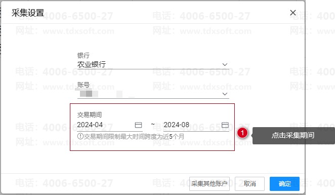 进入采集设置弹窗后,您可以选择需要采集的账户以及对应的交易期间,但由于农业银行限制,仅能采集近5个月的流水信息,比如当前自然月为2024年8月,则只能往前采集5个月的流水,即只能选择交易期间为2024-04~2024-08。