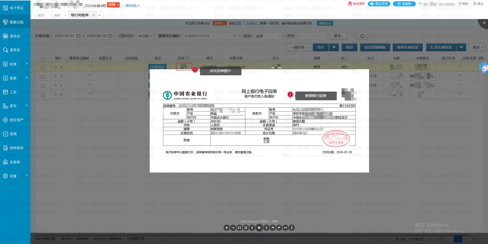 采集完成后,采集流水将在银行对账单页面展示,您可按照需求选择票据凭证模板然后生成凭证,也可点击回单下的图片图标查看银行回单。