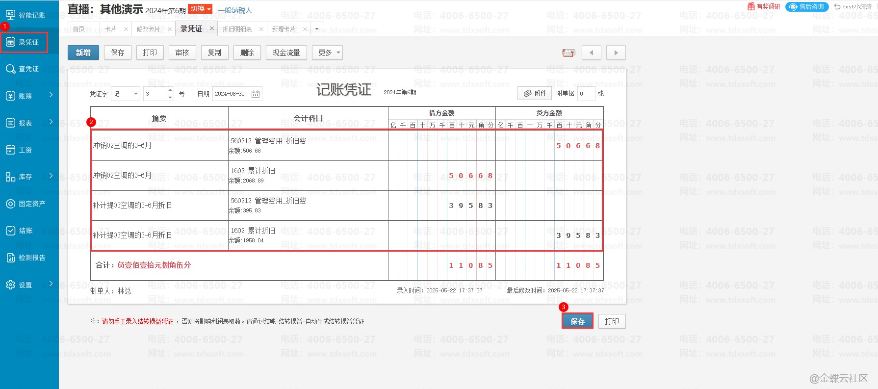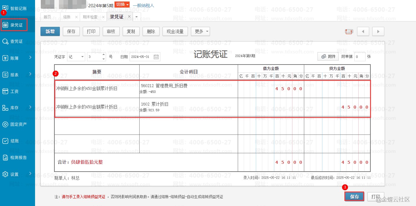 若只想在6月达到账卡累计折旧一致 , 可点击【录凭证】按钮 , 新增凭证把账上多的450金额冲销,凭证分录可参考以下: