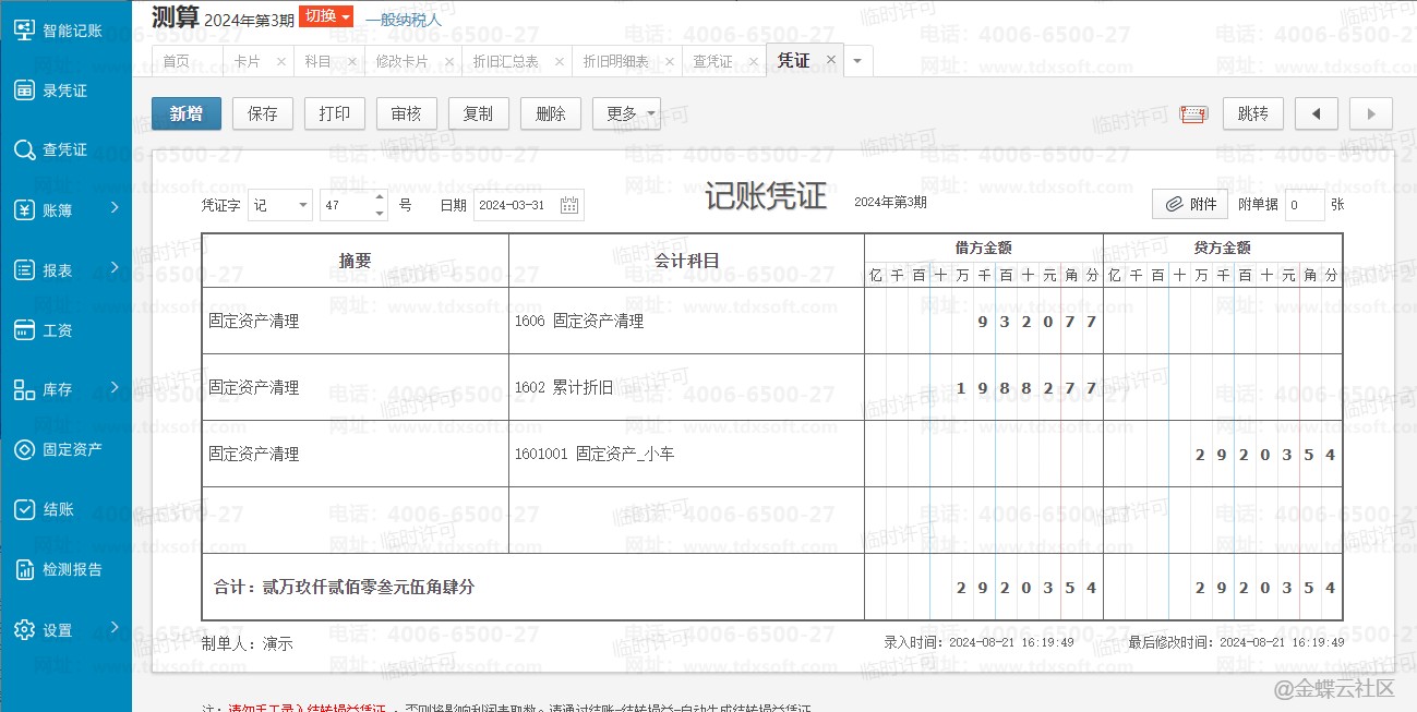 最后录入清理卡片的凭证分录可以参考下方的凭证(仅供参考)