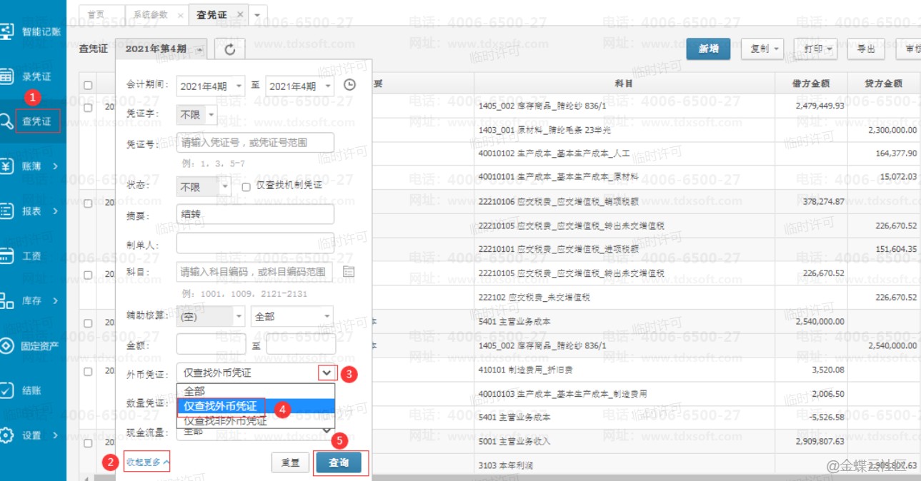 进账套后点击【查凭证】,再点击筛选条件中的更多条件,在外币凭证框中点击倒角符号,选择仅查外币凭证后点击查询,即可以查看到账套录入的外币凭证