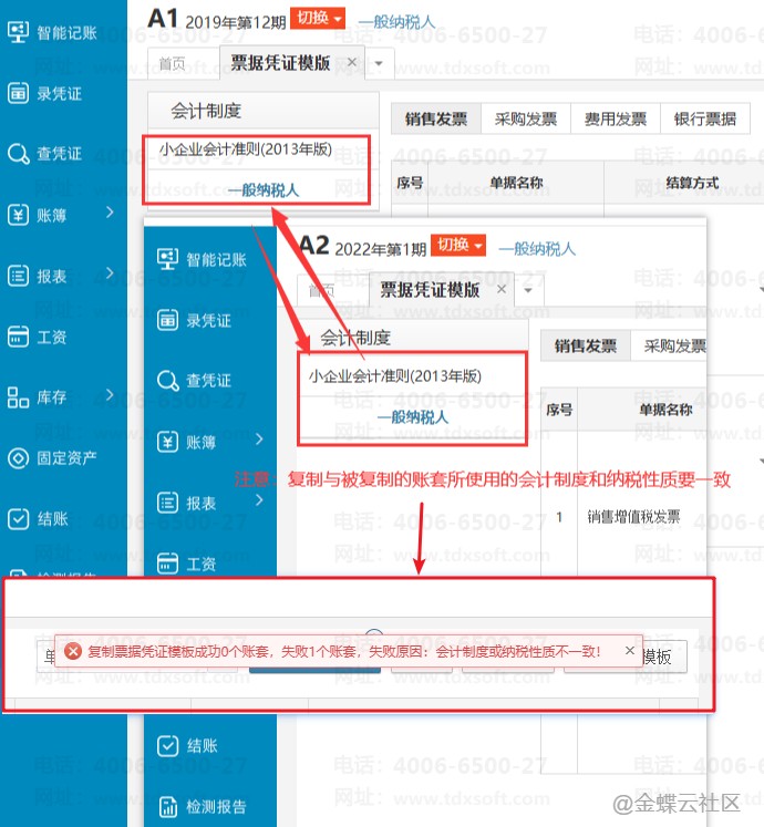 【操作前说明】1、A1和A2账套的会计制度和纳税性质需要一致,如不一致复制会提示“复制票据凭证模板成功0个账套,失败1个账套,失败原因:会计制度或纳税性质不一致!”