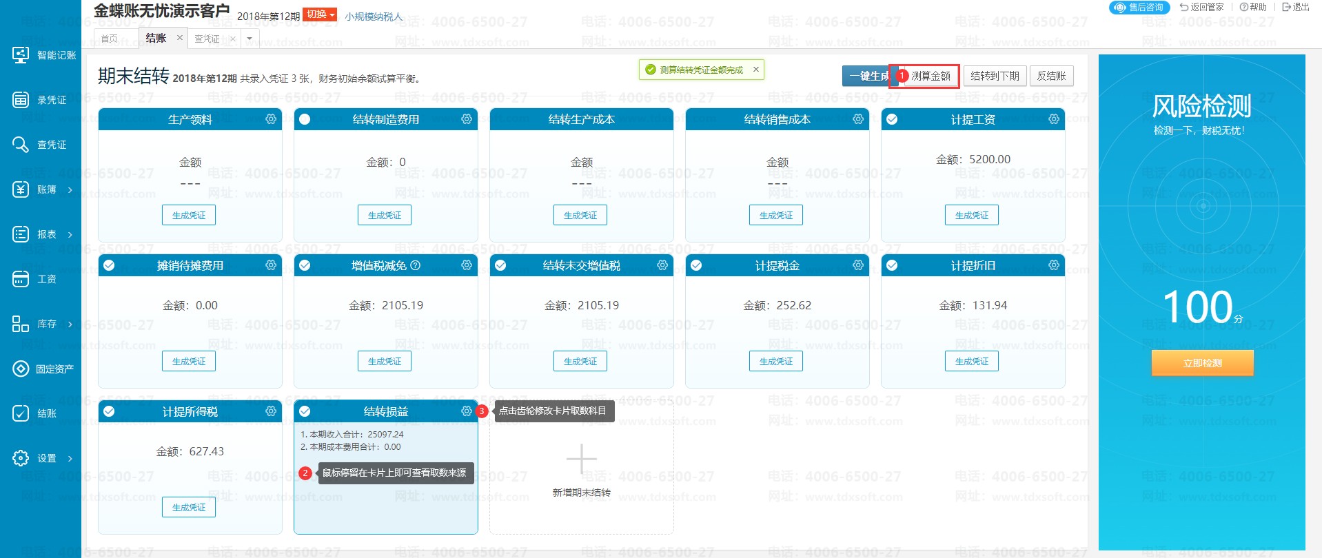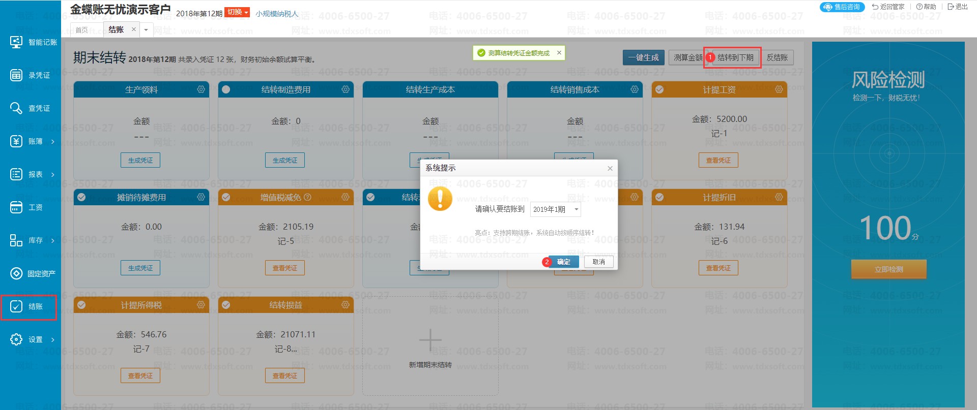 结账界面,点击【测算金额】 -- 【一键生成】 -- 【结转到下期】