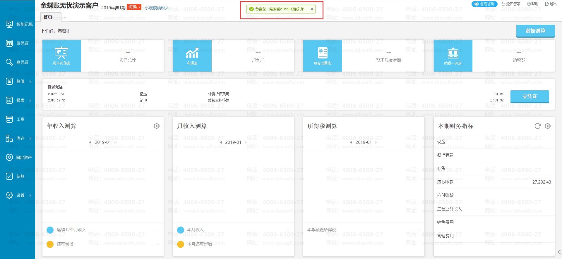 3、点击【结转到下期】,出现下图提示语且当前账期更新表示操作成功