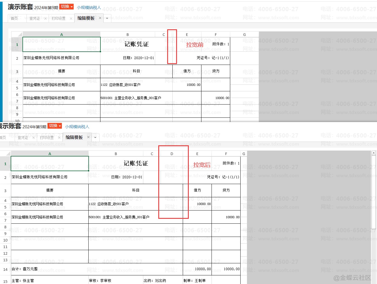 进入【查凭证】界面,点击【打印】→【凭证打印】,点击对应的打印模板的编辑按钮,将鼠标放在D列的的表格线位置,当鼠标变成双箭头符号时,像拉宽excel表格一样将D列拉宽即可。