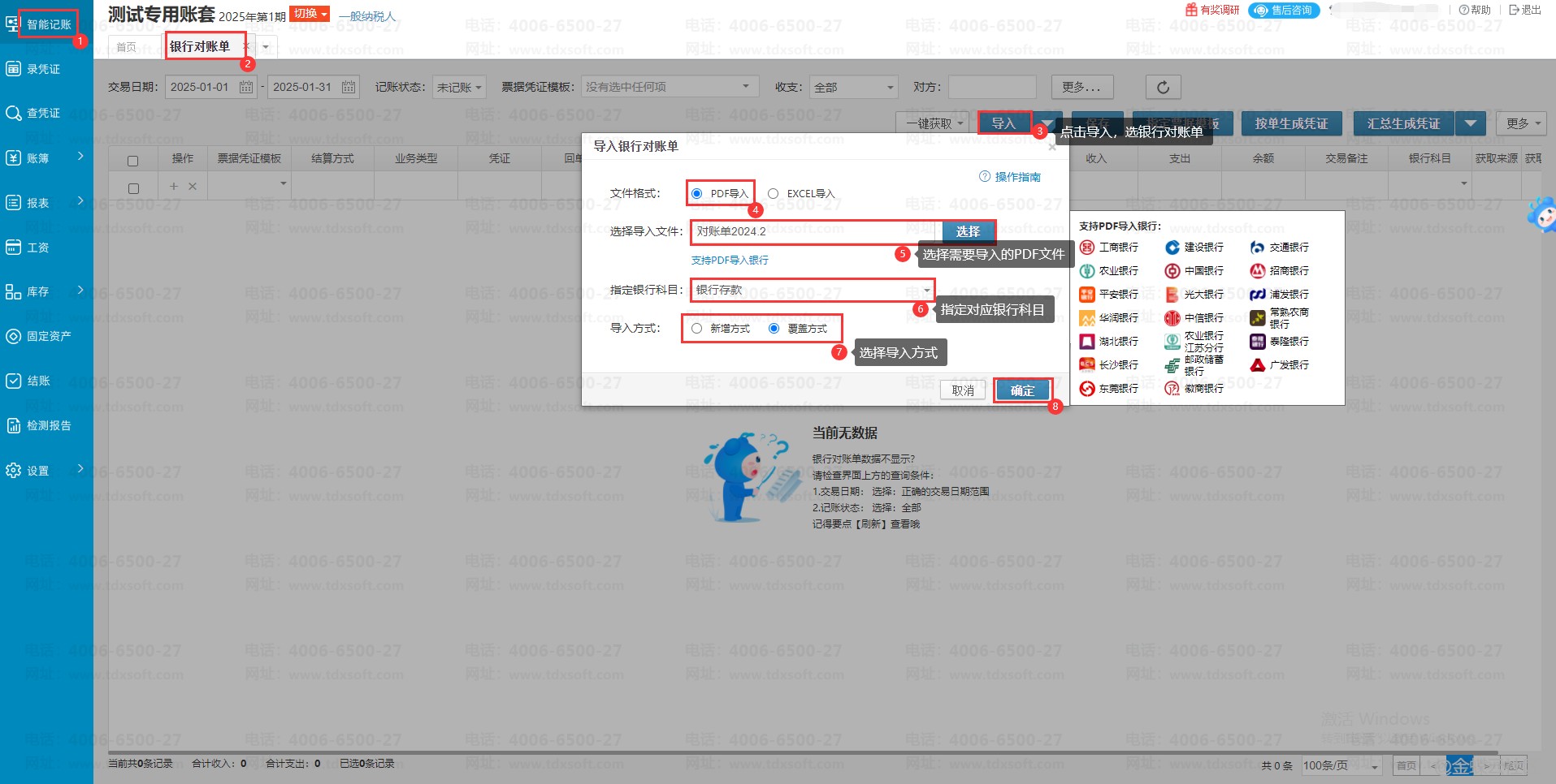 进入账簿点击【智能记账】 →【银行对账单】→【导入】选择导入银行对账单,在弹窗中,选择PDF导入方式,选择对应的银行PDF文件,指定银行科目,选择对应的导入方式。选择完成后,点击【确定】