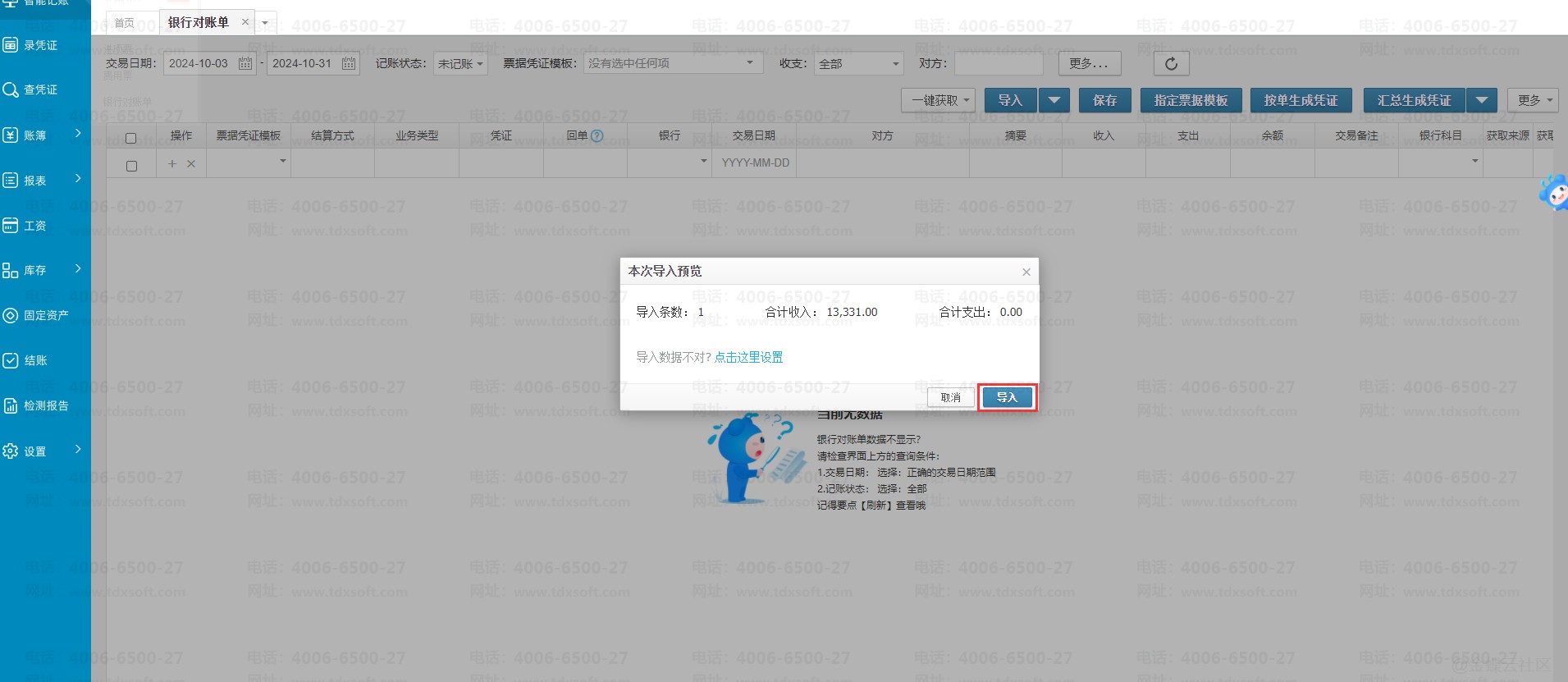 2.系统识别银行对账单表格数据成功后,会展示本次导入预览弹窗,显示导入表格中的汇总数据,确认数据无误就可以直接点击【导入】按钮
