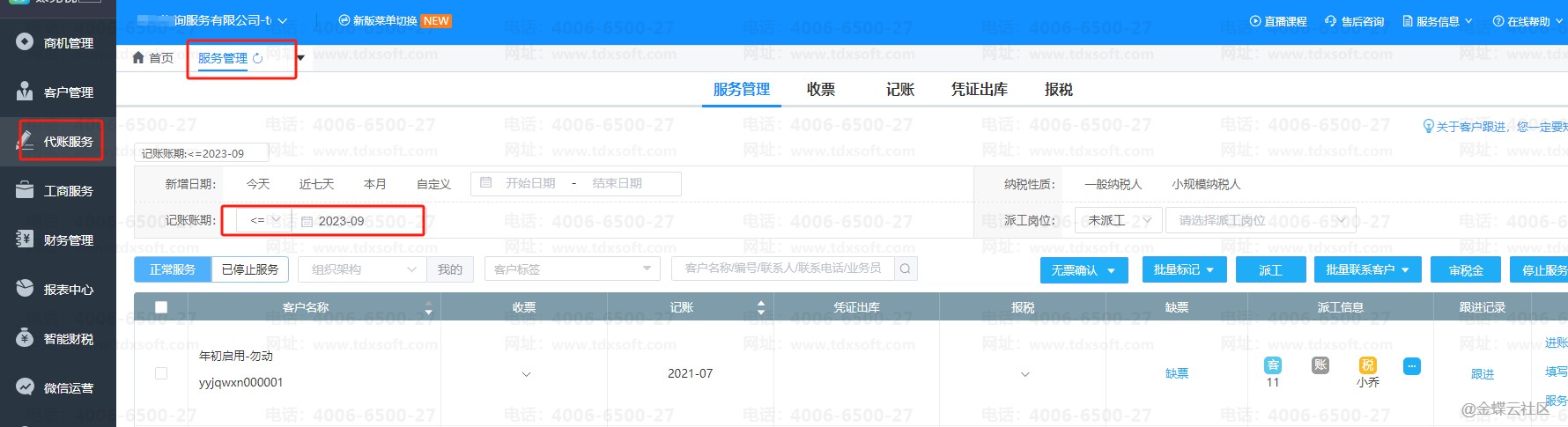 点击【代账服务】→【服务管理】,找到【记账账期】,录入查询期间,即可快速检索出对应客户数据