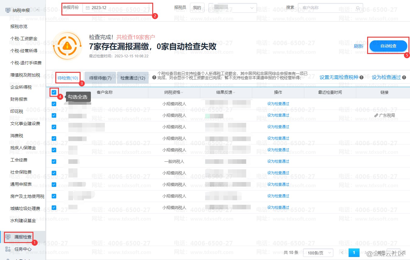 登录智能税务后点击【漏报检查】,选择对应【申报月份】后点击【待检查】,勾选所有要检查的客户点击【自动检查】即可开始漏报检查。