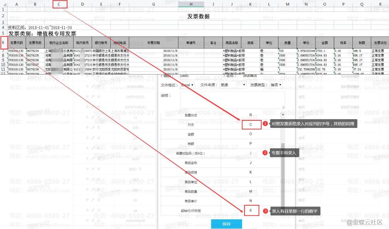 2、 设置导入模板:打开发票模板需要和销项发票表格的格式一致,对应关系如下图;