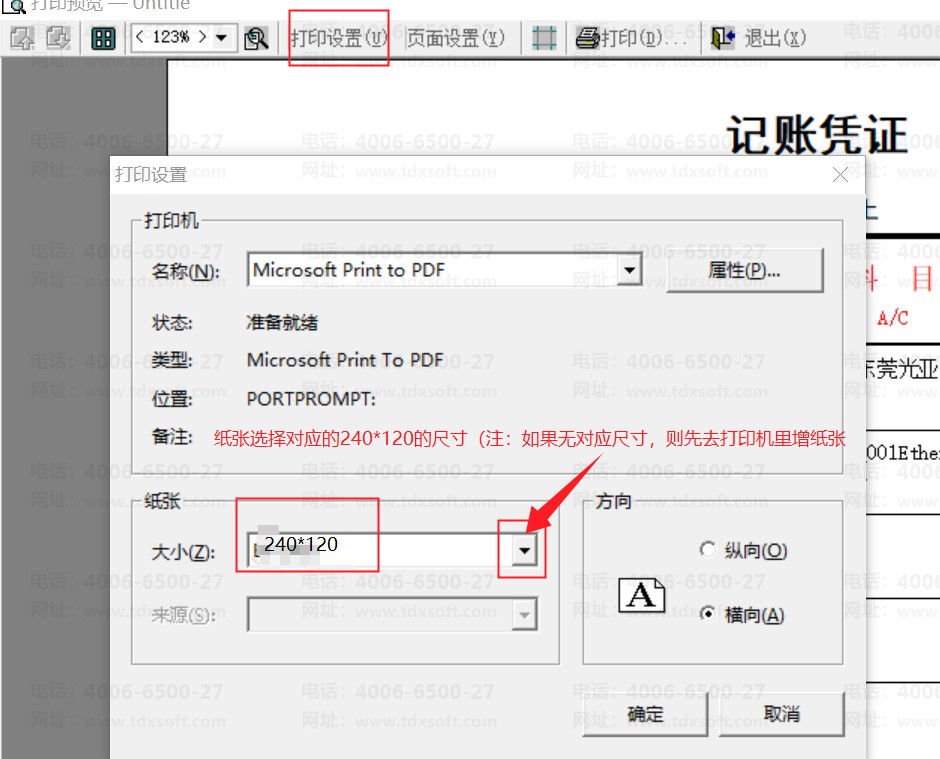 2.打开下载好的套打凭证文件,在预览界面左上角点击【打印设置】,纸张选择尺寸是240*120的纸张,如果没有这个尺寸的纸张,那需要在打印机连接的那台电脑主机自定义新增这个尺寸的纸张(共享电脑不可以新增纸张尺寸)
