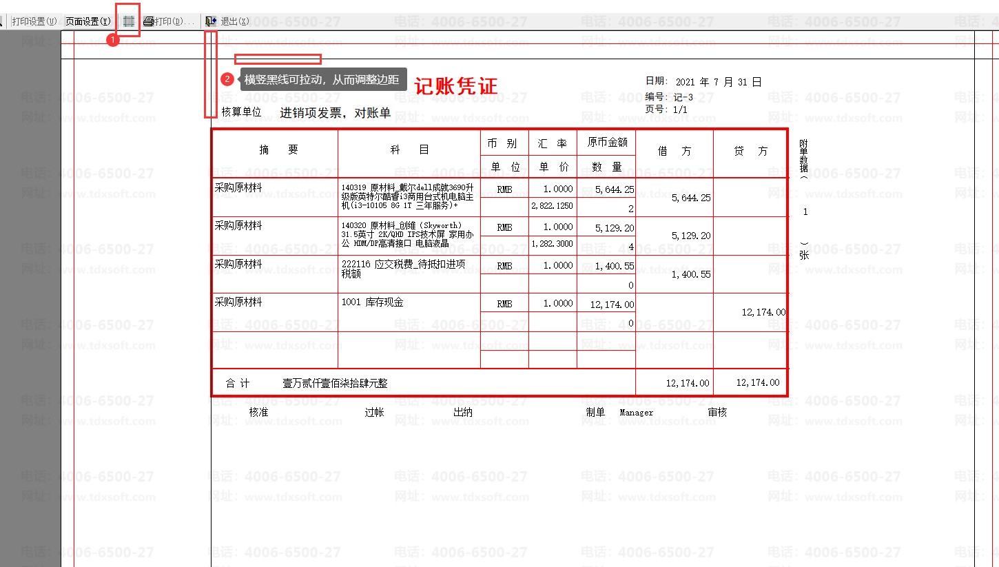 3.如果打印出来的效果有所偏移,可以在打印预览界面,点左上角的“#”,拉动横竖黑线,可调整边距到合适的效果。