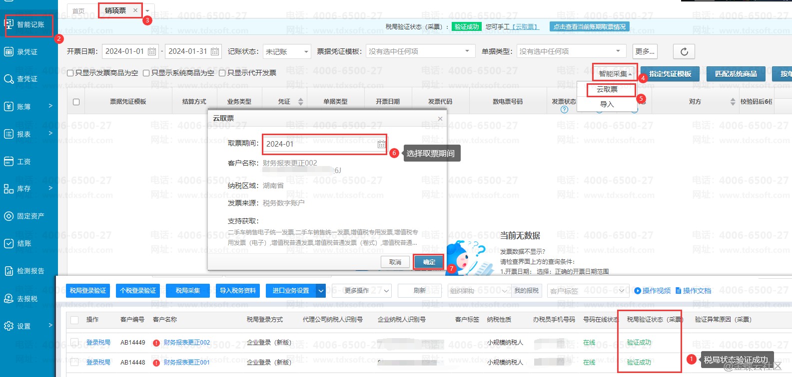 看到提示授权成功后,再次点击【智能采集】→【云取票】,在云取票弹窗中选择好取票的开票期间后,点击【确定】按钮后,系统即开始取票,取票成功后会出现提示取到票的张数和金额。