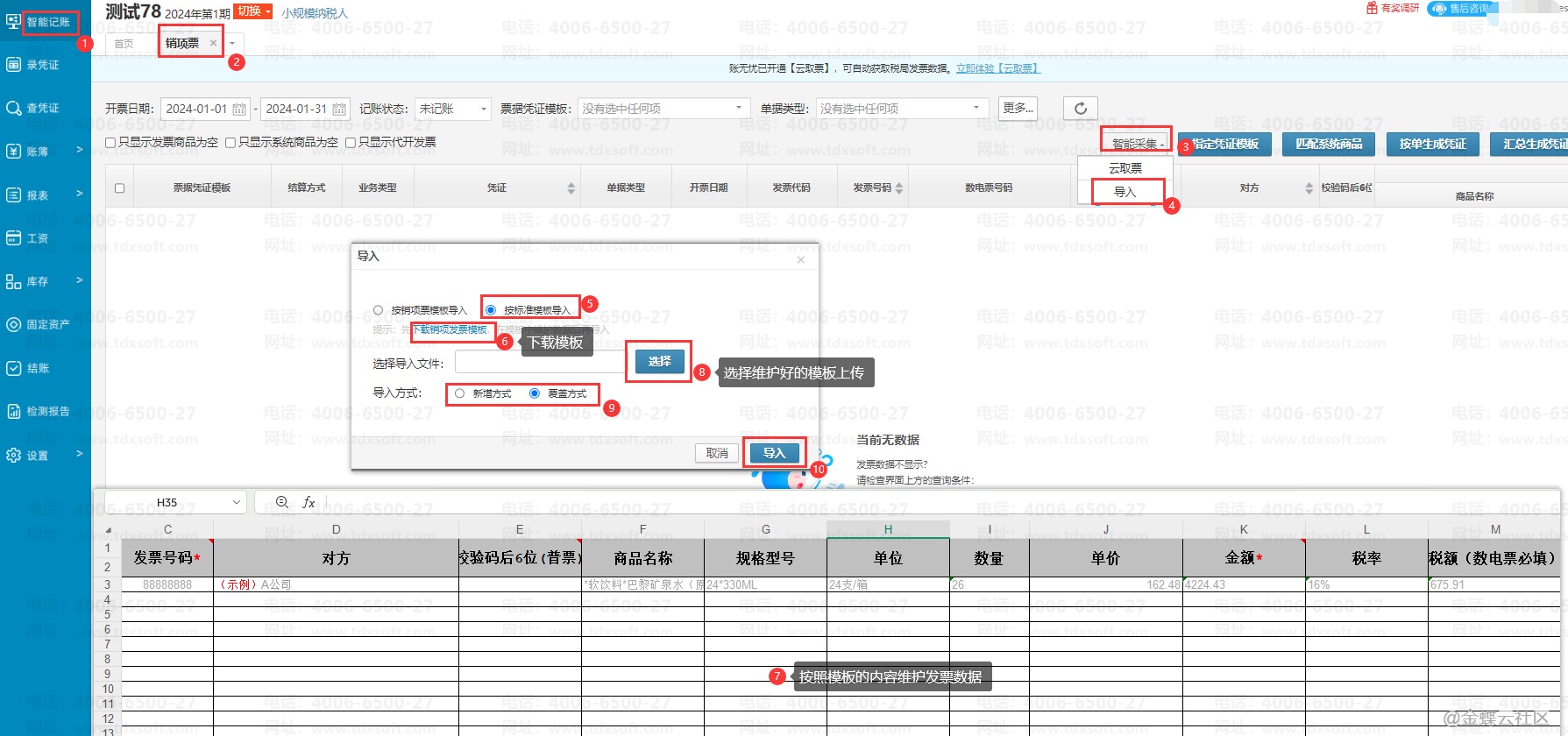 登录账无忧,进入账簿后点击【智能记账】→【销项票】,进入销项票界面,点击【智能采集】→【导入】按钮,在导入的弹窗中,选择【按标准模板导入】,先点击【下载销项发票模板】,然后在下载的模板中填写好发票的数据,点击【选择】按钮,选择填写好的模板文件,再选择导入方式后点击【导入】即可。
