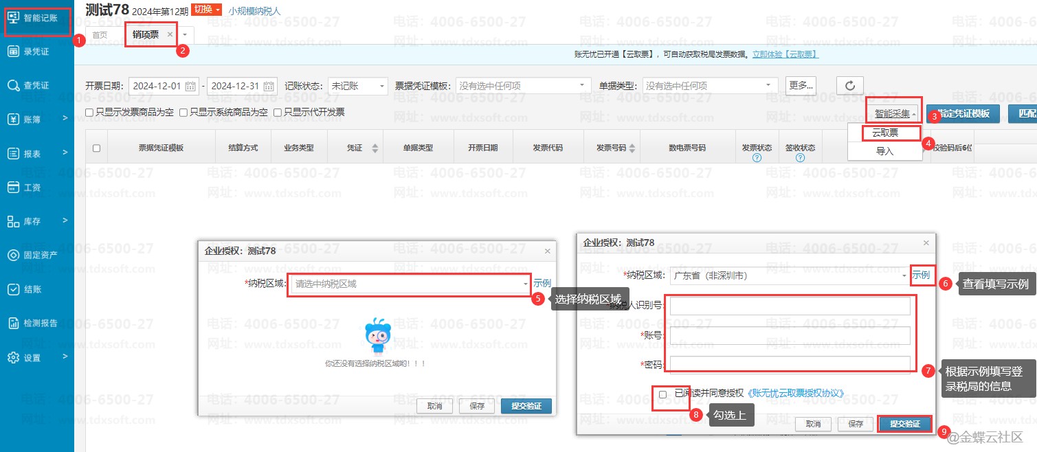 登录账无忧后,点击【智能记账】→【销项票】,进入销项票界面,点击【智能采集】→【云取票】,首次需要选择纳税区域,并填写好相关的登录税局的账号密码后,勾选“已阅读并同意授权”选项,确认信息无误后,点击【提交验证】按钮。