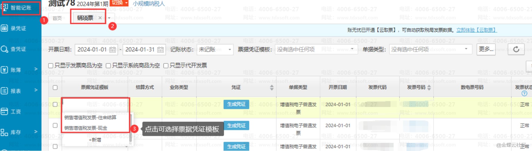 销项发票导入的系统里之后,进入账簿,点击【智能记账】→【销项票】,进入销项票界面,点击发票数据上票据凭证模板列,可选择票据凭证模板。