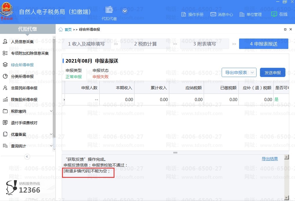 个税申报返回提示申报表校验不通过,【原因】自然人系统异常,未下载到街道乡镇代码,请稍后重试