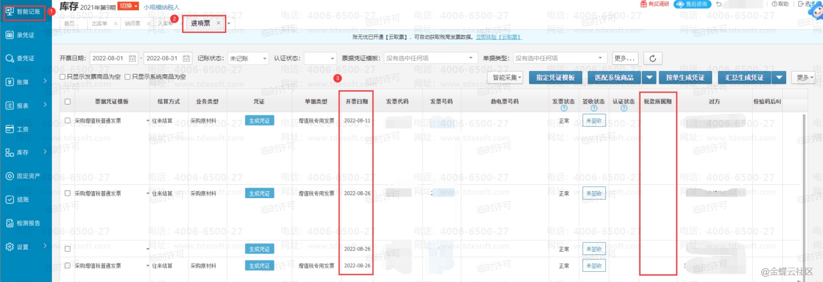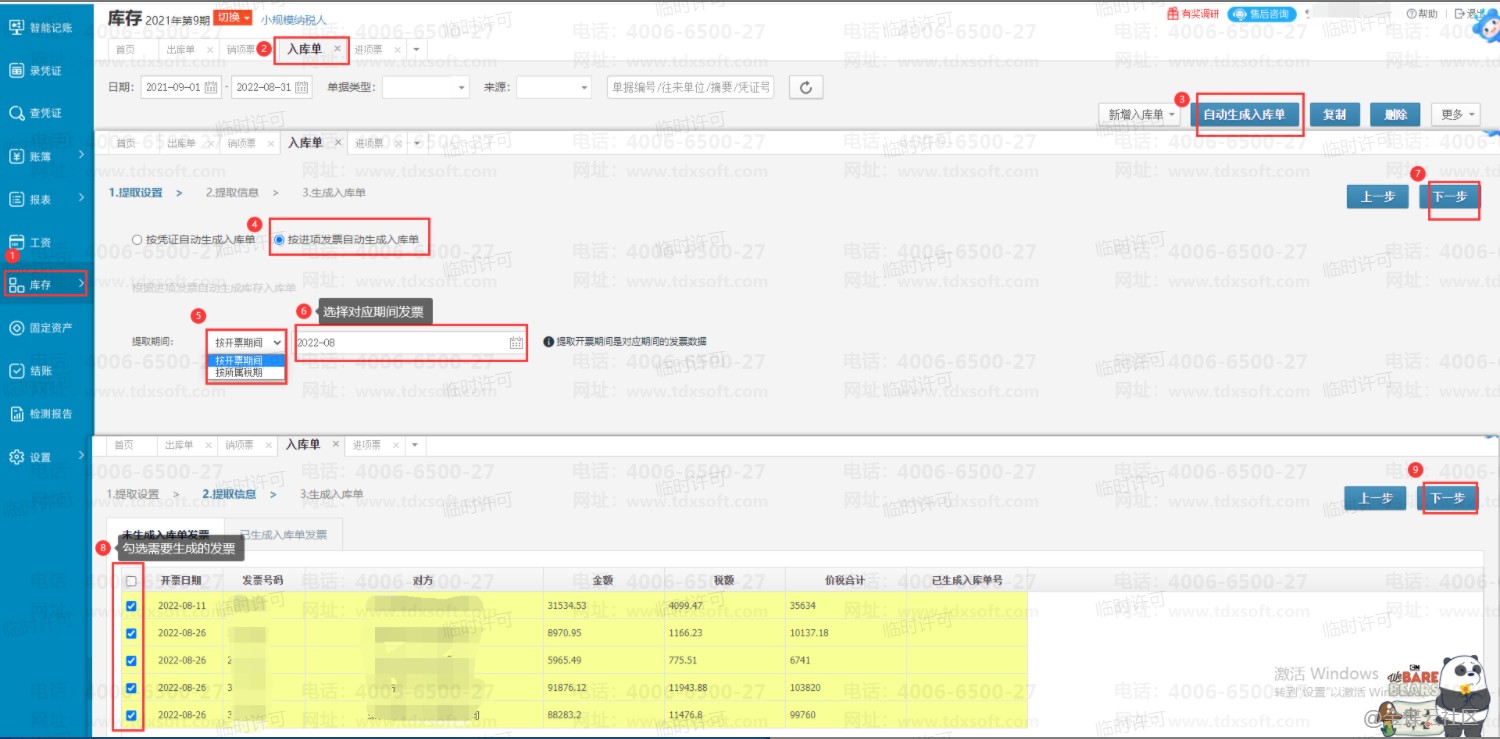 如下图:比如导入8月的发票,要生成8月的入库单