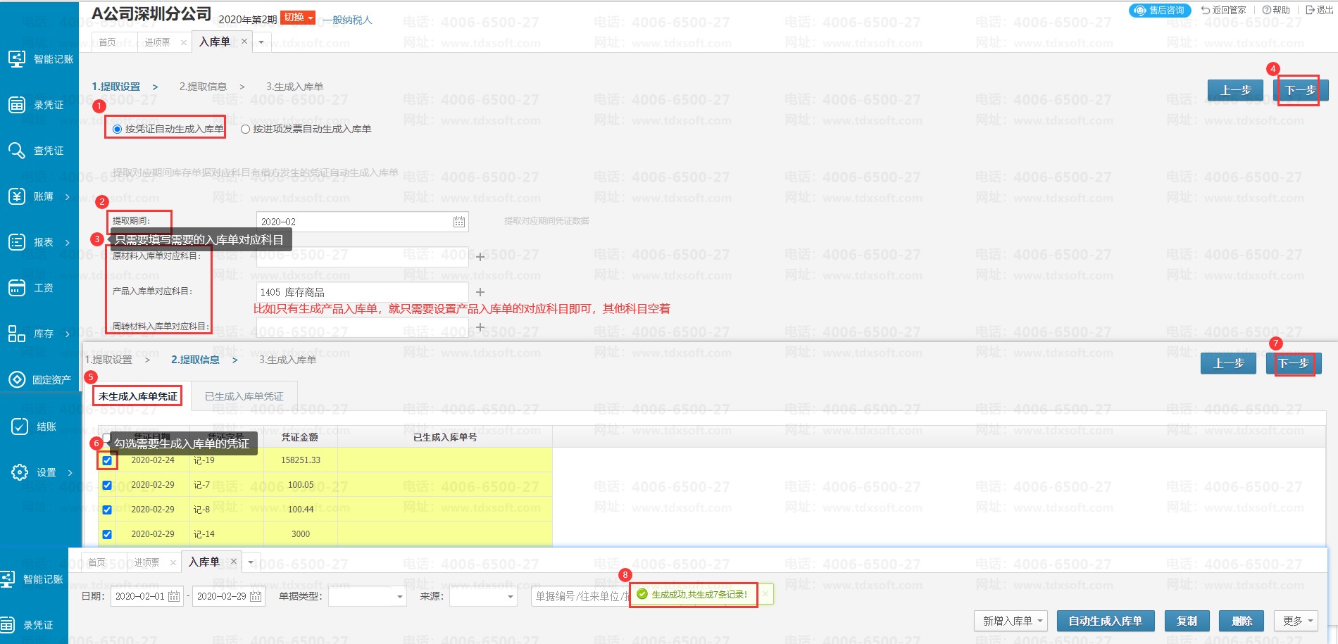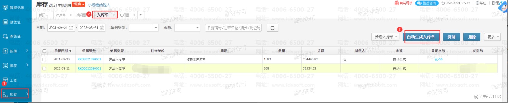 在【库存】→【入库单】点击【自动生成入库单】,点击【按凭证生成入库单】选择提取的凭证期间和入库单对应科目 后点击【下一步】 ; 勾选需要生成入库单的凭证 再点击【下一步】即可生成入库单。