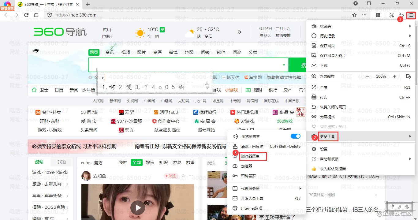 双击打开360浏览器,点击右上角三横线图标,把鼠标箭头放在【更多工具】上面,点击【浏览器医生】