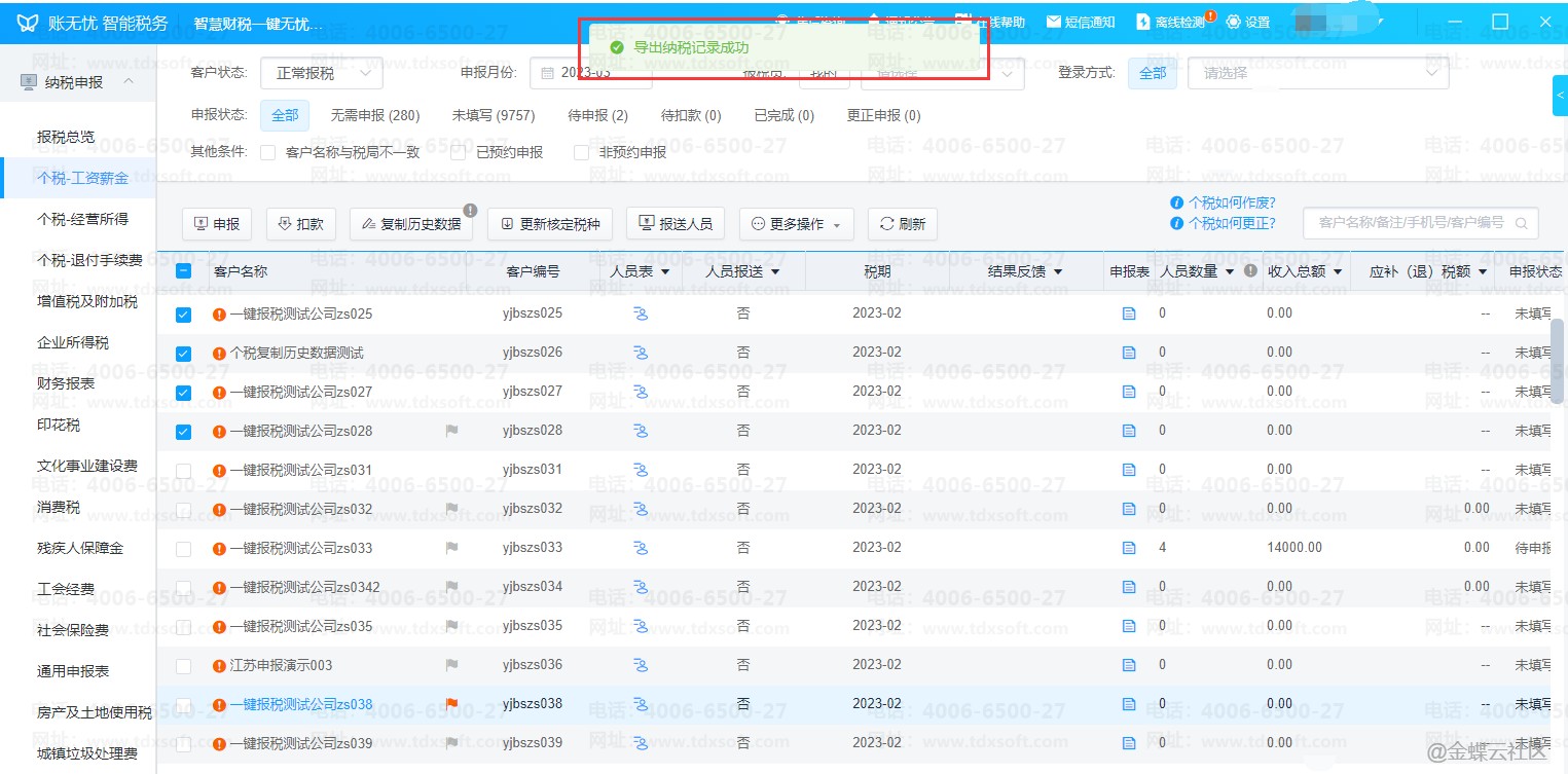 在个税-工资薪金界面,批量勾选上需要导出纳税记录的客户,点击【更多操作】选择【导出纳税记录】。在弹出的窗口中选择要导出的记录日期,然后【确定】,下一步还需要选择要导出文件的存放路径,选择后【保存】即可开始导出。