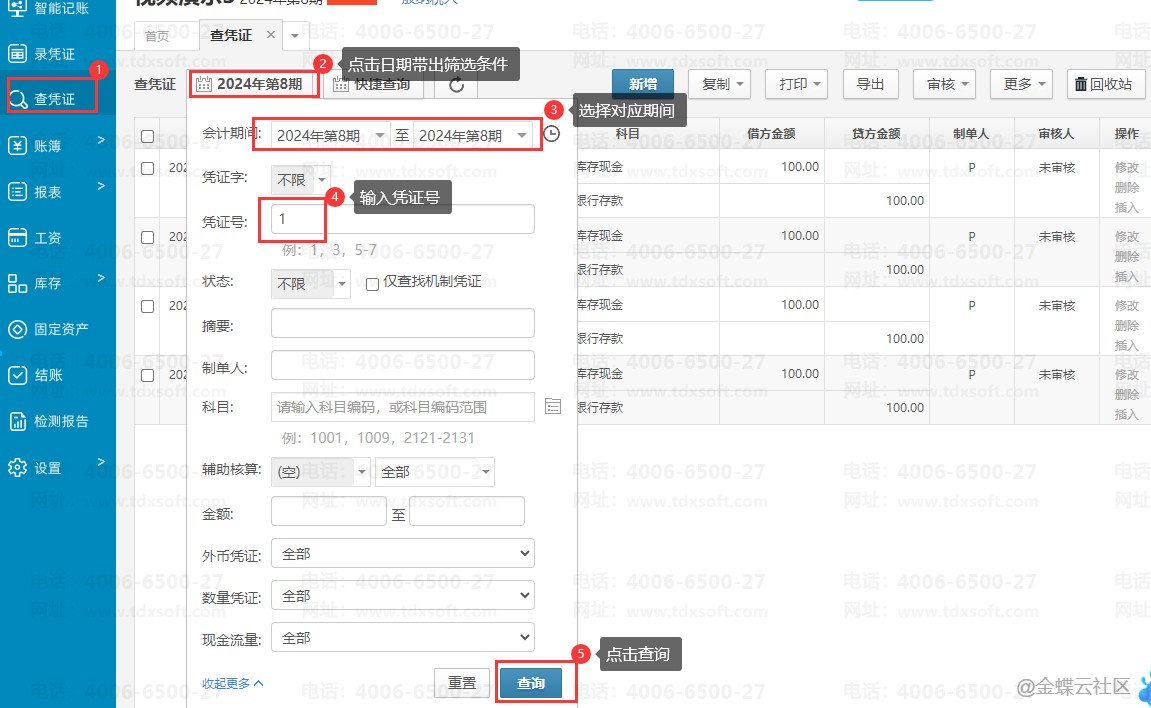 1、修改单张凭证日期步骤:在【查凭证】界面输入凭证号或其他筛选条件后可进行查询,查询后,点击凭证号可进入编辑凭证界面。