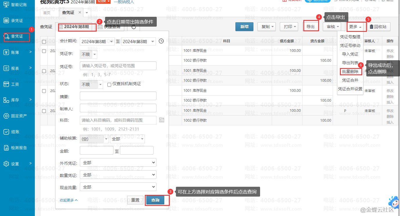(2)导出凭证:在【查凭证】界面先选择筛选条件筛选出需要导出的凭证,然后在点击页面上的【导出】按钮即可导出凭证,并【删除】系统中这些凭证。