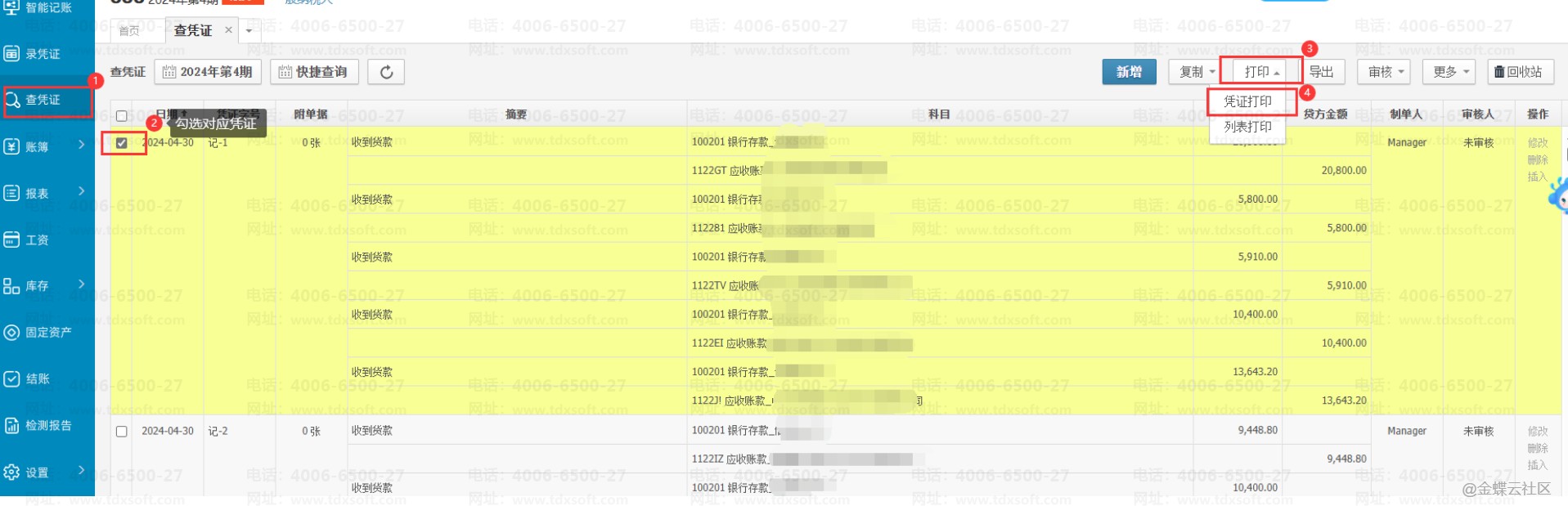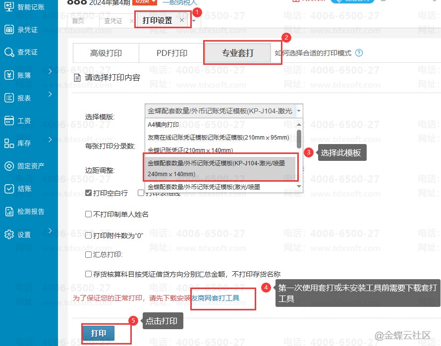 1.进账簿后,进入【查凭证】界面,选择好需要打印的凭证,点击打印,选择专业套打,套打模板选择【金蝶配套金额记账凭证模板(激光/喷墨240mmⅹ120mm)】