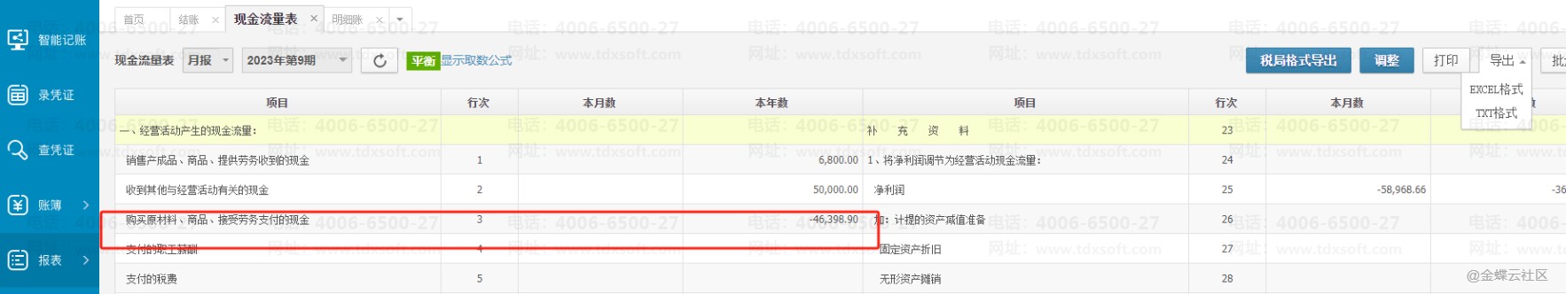 1.进账簿后点击【报表】→【现金流量表】,再点击右上角的【调整】按钮。
