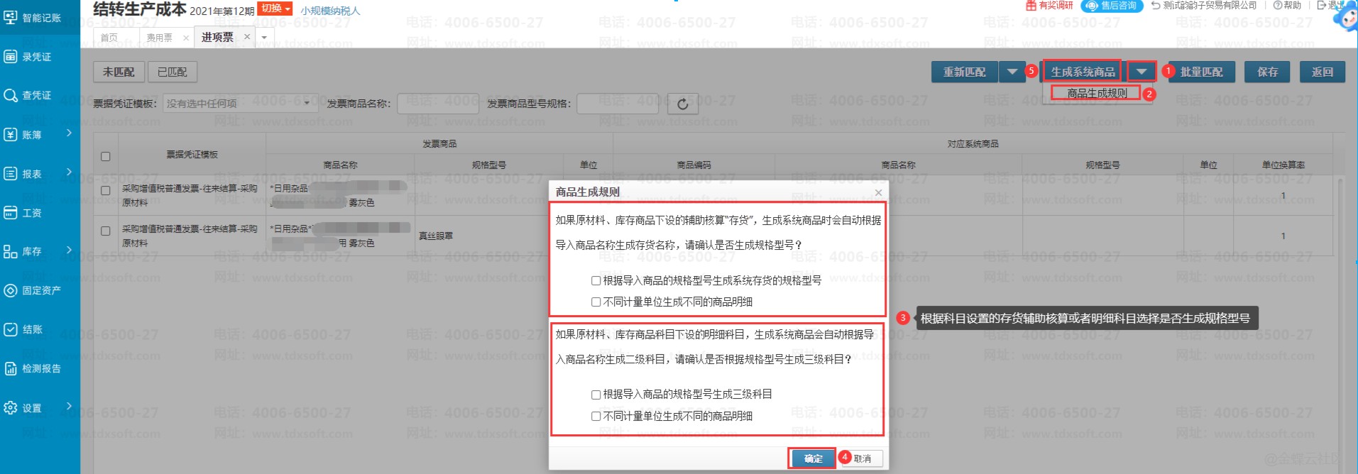 3、发票上有的明细在系统中没有对应的做账科目名称,可以点击右上角【生成系统商品】按钮旁边的倒三角符号,先点击【商品生成规则】按钮,在商品生成规则弹窗中,根据需求选择相同商品是否区分规格型号和单位去生成,不需要则不勾选,设置完成后点击【确定】按钮。再点【生成系统商品】,可以看到界面上会显示出系统生成的对应科目。