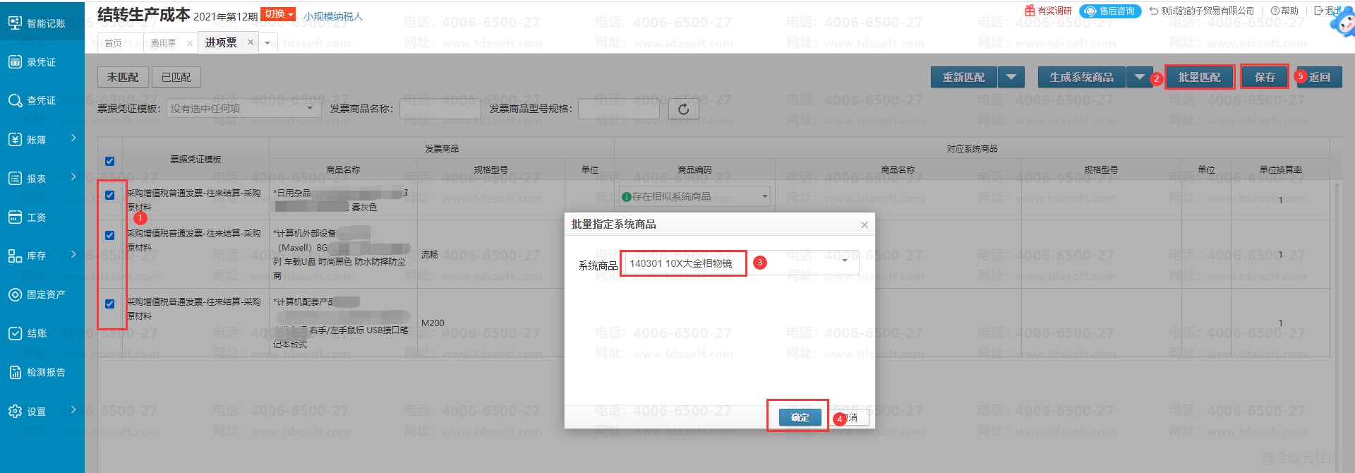 1、进账簿后点击【智能记账】→【进项票】,勾选需要匹配的发票再点击【匹配系统商品】