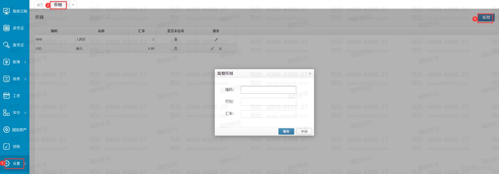 1、点击【设置】→【币别】 页面,点击新增币别和汇率