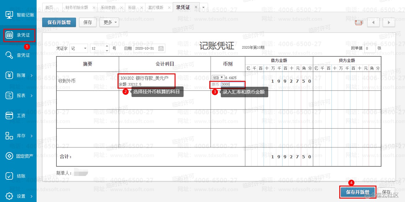 3、进账套后,点击【录凭证】页面,选择挂外币核算的科目,录入原币和汇率,系统会自动计算本位币的金额。