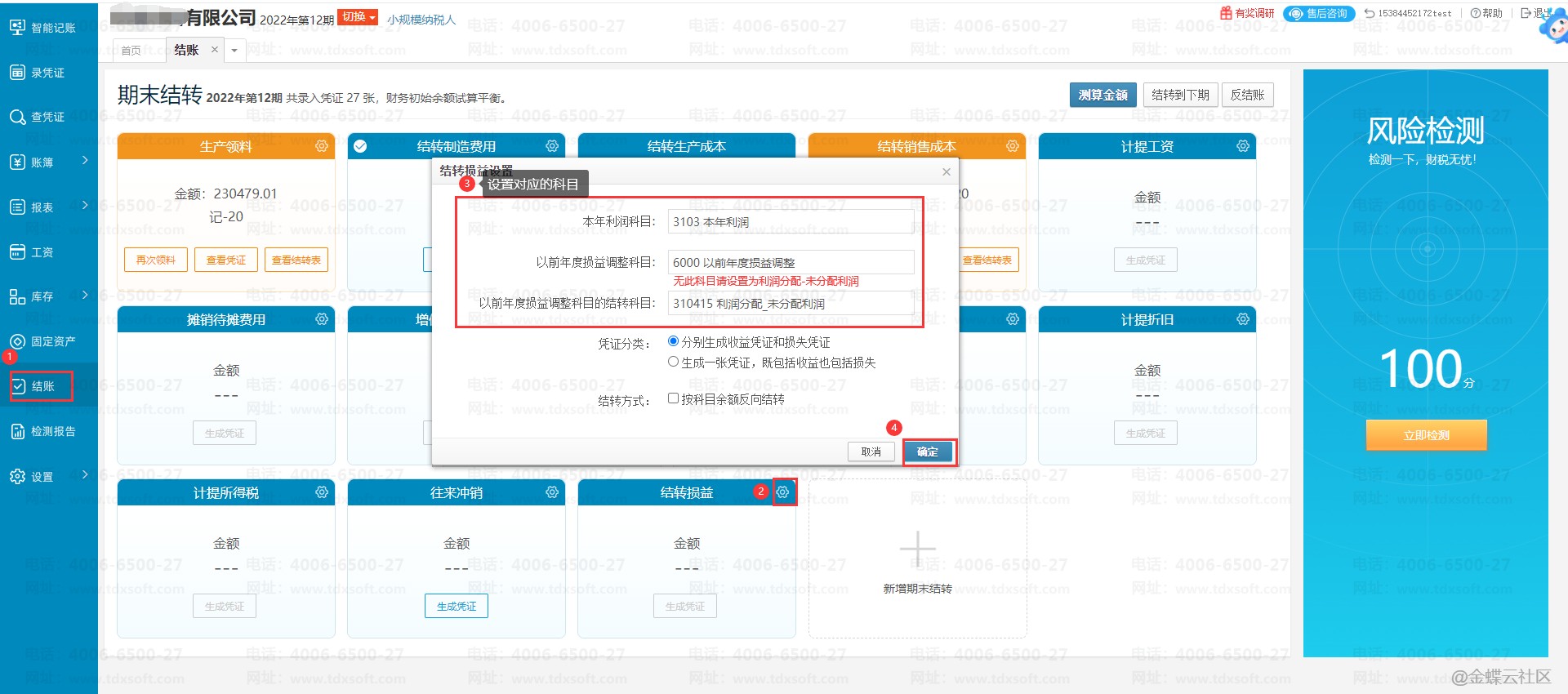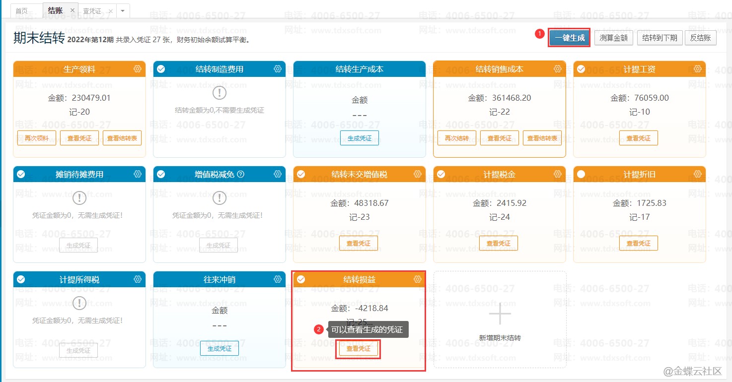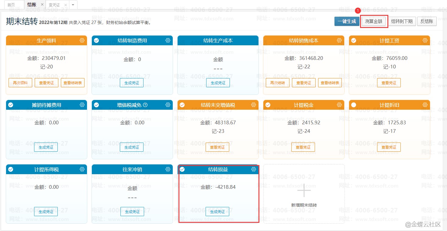检查结转损益模块科目设置后点击【测算金额】→【一键生成】